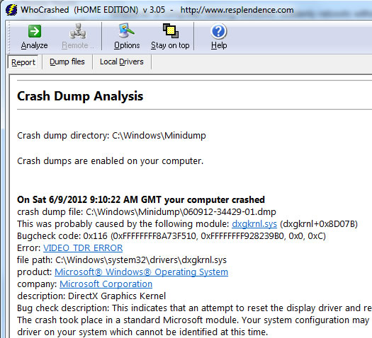 WhoCrashed is a software for Windows that allows users to analyze crash dump files to see what is causing the system crash. After installing just click analyze, it will show what is causing the crash, whether a driver or a kernel module. The error report also includes helpful links to online resources like MSDN library documents for more information errors and how to prevent them happening.