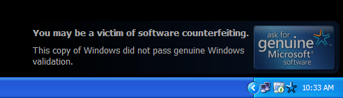 After installing this version of WGA notifications, XP users whose OS failed to validate will discover on their next logon the their desktop has changed to plain background. Users can revert to their background image but the black background will reappear after 60 minutes, this will continue until users get the genuine windows OS. Also users will see notifications on their desktop system tray, you can’t click on it or do anything to it. Via ZD Net