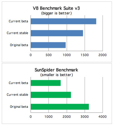 This beta version is 25% faster on V8 benchmark and 35% faster on the sunspider benchmark than the current stable version and almost twice as fast compared to original beta of Google Chrome according to a blog post on Chrome blog.