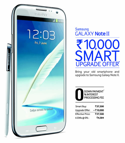 The offer is valid on smartphones currently in working condition and buyers have to carry a self attested government issued ID card copy, smartphone and charger to avail the offer. The offer is valid till June 30th 2013 or till stocks last. Galaxy Note II official price is Rs. 37,500 and with this offer it comes down to Rs. 27,500. Buyers can also avail 6 months EMI facility using select credit cards, in that case they have to pay Rs. 4,584 monthly.
